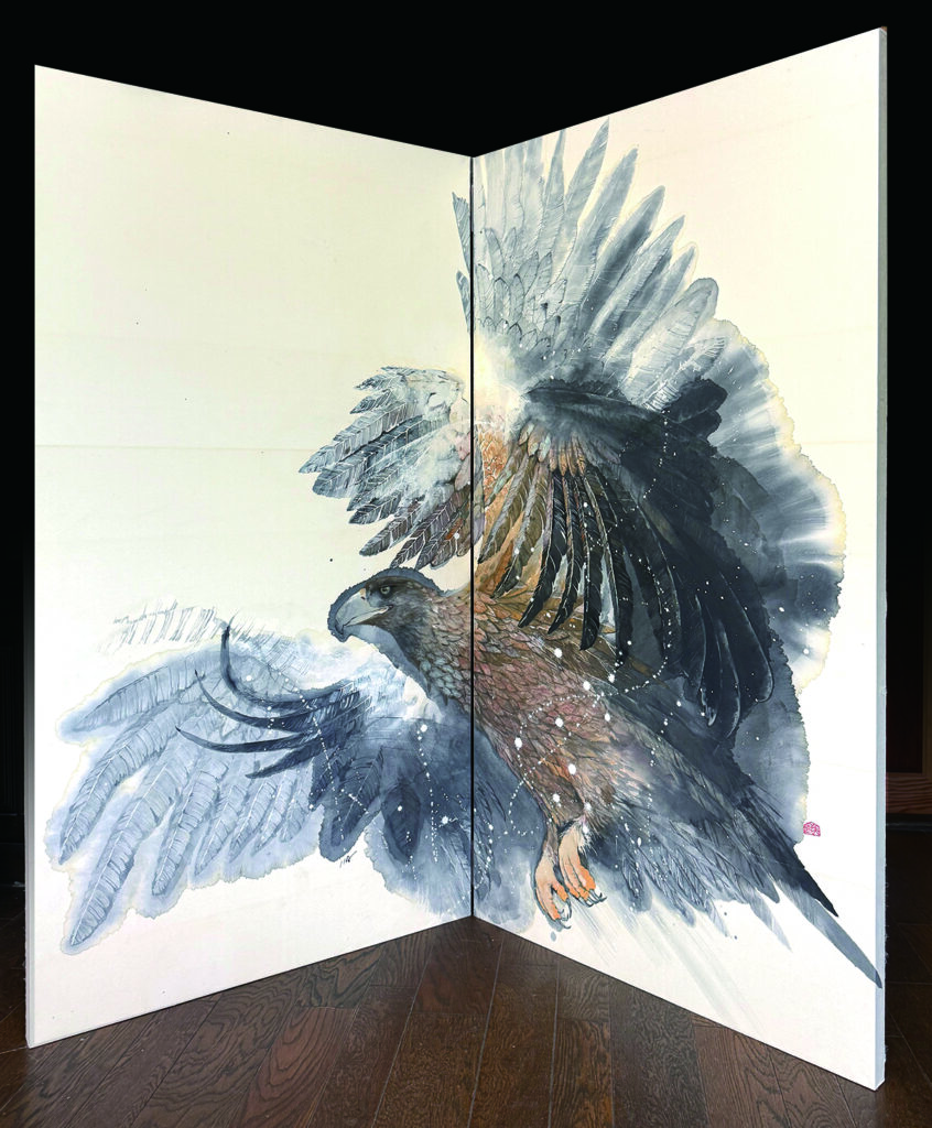 This is drawn by Mihoko Inazawa, is a regular exhibit of Suimei Gallery at Zama Shinto Shrine. Mihoko is known as an artist who energetically expresses “Inherited Japanese Culture” through her modern Nihonga. I think that the root of Mihoko’s creation is 『Mind and Tradition』and a firm belief of 『Man is a part of Nature』concept. Through her art, Mihoko passes on adoration of nature and awareness of global environment into the future.
